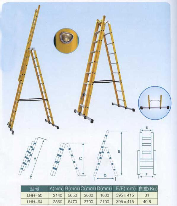 絕緣人字梯規(guī)格:1米人字梯、2米人字梯、3米人字梯、4米人字梯、5米人字梯、6米人字梯 【可根據(jù)要求定做】 絕緣梯材質(zhì): 玻璃鋼(玻璃纖維和不飽和樹脂等幾大復(fù)合材料加工成型),強(qiáng)度能與鋼鐵比肩而立,今年來一直是電力部門選材質(zhì)。